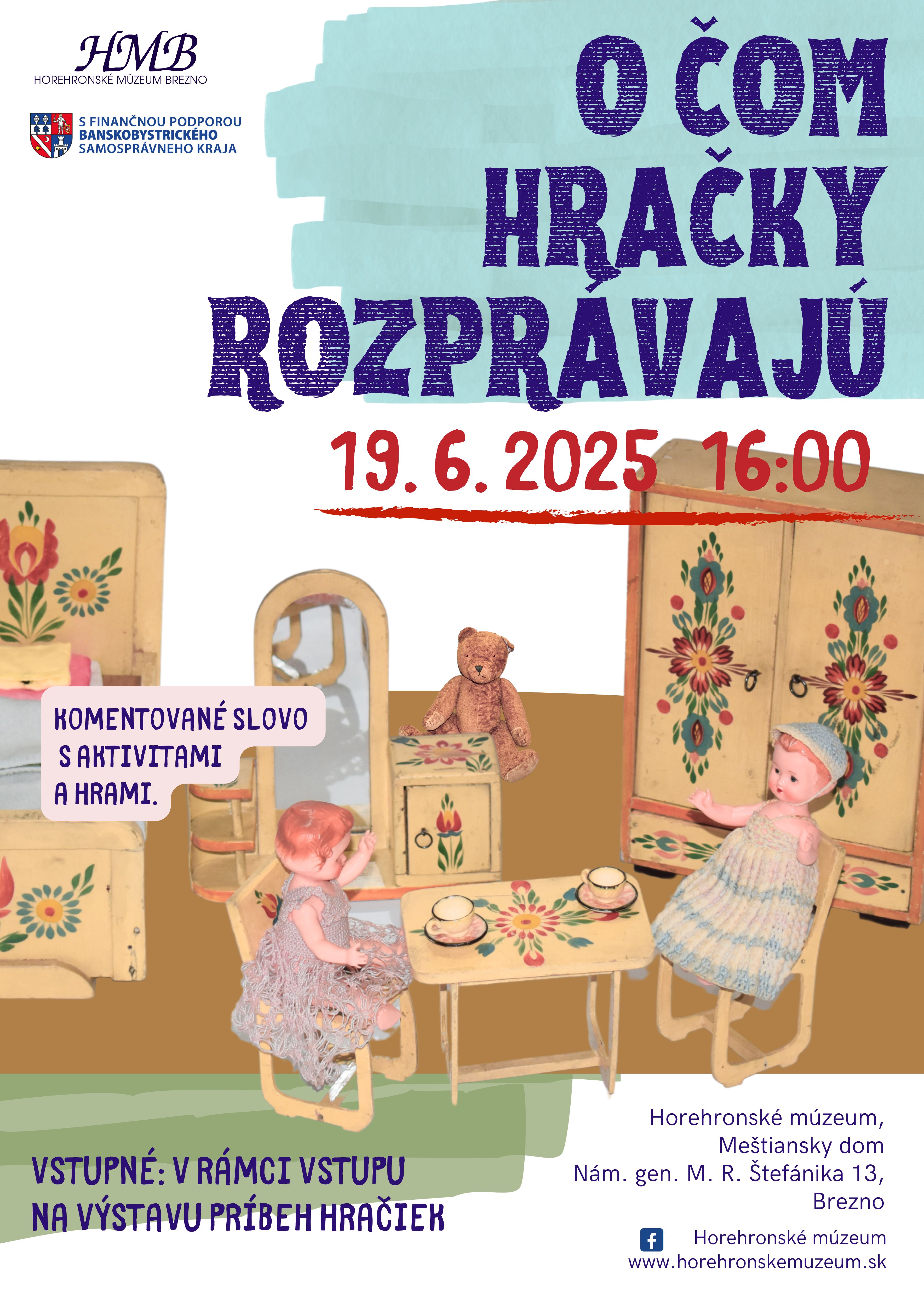 Horehronské múzeum si v rámci aktuálnej výstavy PRÍBEH HRAČIEK pripravilo špecializované podujatie pod názvom O čom hračky rozprávajú. Uskutoční sa vo štvrtok 19. 06. 2025 o 16:00 hod. v Meštianskom dome.
