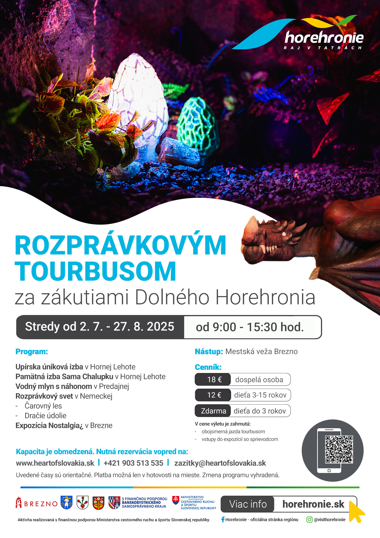 Odvezte sa z mesta Brezno Rozprávkovým tourbusom do subdestinácie Dolné Horehronie, a to každú stredu počas letných prázdnin v termíne od 2. 7. do 27. 8. 2025 v čase od 9:00 - 15:30 hod. spred Mestskej veže Brezno s Infocentrom vo zvonici.