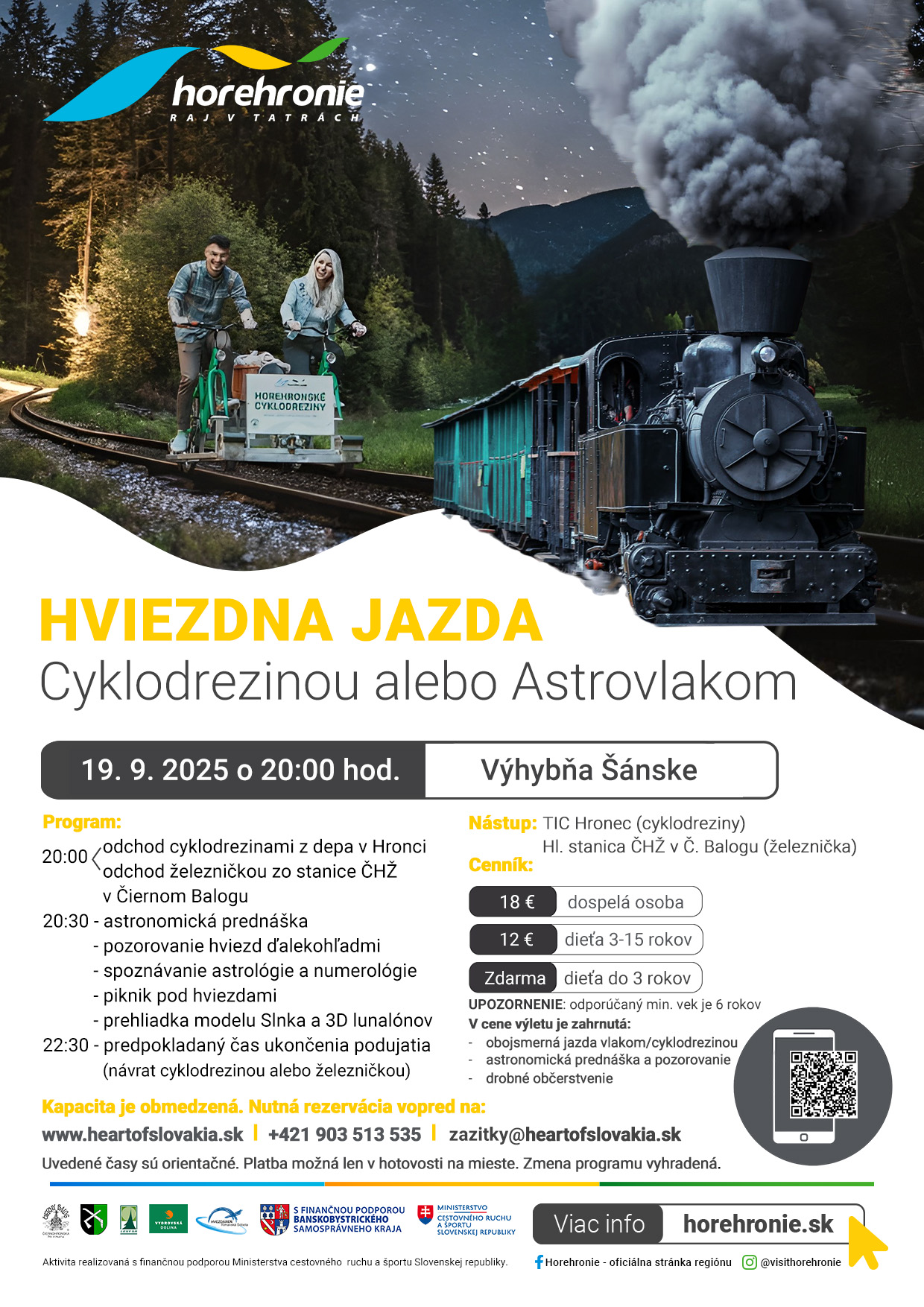 | Hviezdna jazda Cyklodrezinou alebo Astrovlakom | 19.09.2025 20:00 | 0.00€ |